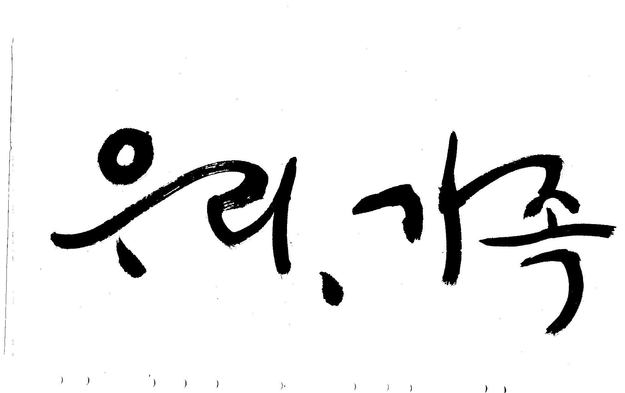 기축년 신년 으뜸말 휘호 김철호 일반 0 4744 2009.01.02 20:21 어떤 으뜸말이 올해엔 필요할까... 고민하다가.. 언제나 그랬듯이 어려울때에는 무엇보다도 우리라는 공동체의 가치관이 더 필요할것 같고 가족이라는 최소의 가치가 (여기서 최소라고 하는것은 가치를 말하는 것이 아니고 가장기본적인 단위를 말하는 것입니다.) 무엇보다도 앞서야 한다고 느꼈으므로 "우리"와 "가족"을 주제어로 정했습니다. 이것은 무조건 내 생각입니다. 다른분들은 다른 주제어가 있겠죠... 어쨌든지 ... 새해엔 행복하고 건강하세요..